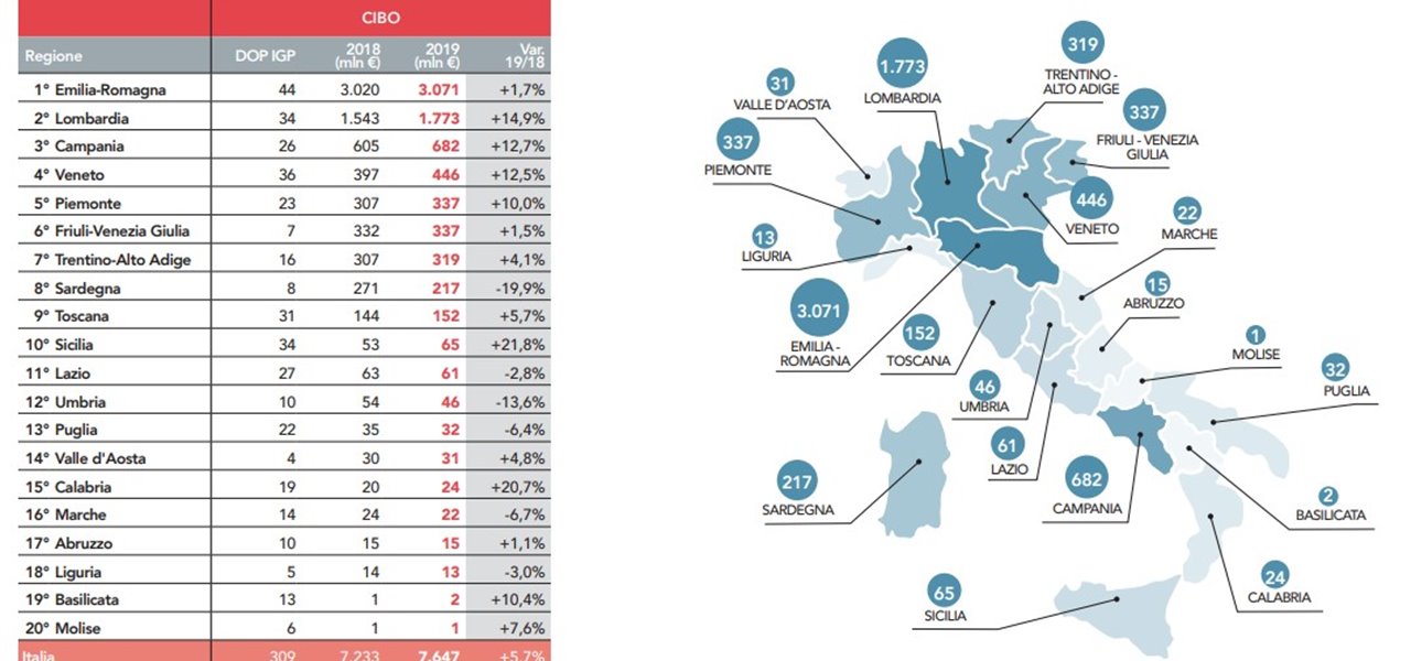 Le IG della Regione hanno prodotto quasi 1 miliardo di euro nell'ultimo periodo: 647 milioni sono stati generati dal reparto vitivinicolo, 337 dall'alimentare. Una crescita rispetto all'anno precedente attestata attorno al + 6,3%.